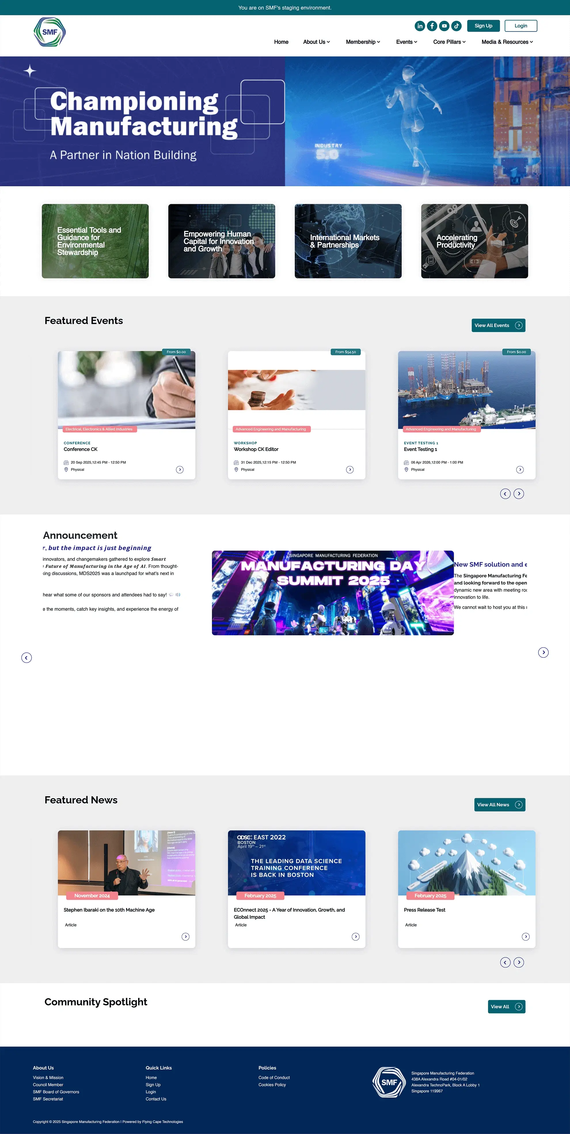 We developed a membership and event management system for the Singapore Manufacturing Federation (SMF), enabling members to easily sign up, renew memberships, and book events or training programs online. The system allows SMF to manage memberships, events, communications, payments, and reporting in a centralized, user-friendly platform aligned with their mission of driving digital transformation within Singapore’s manufacturing sector.