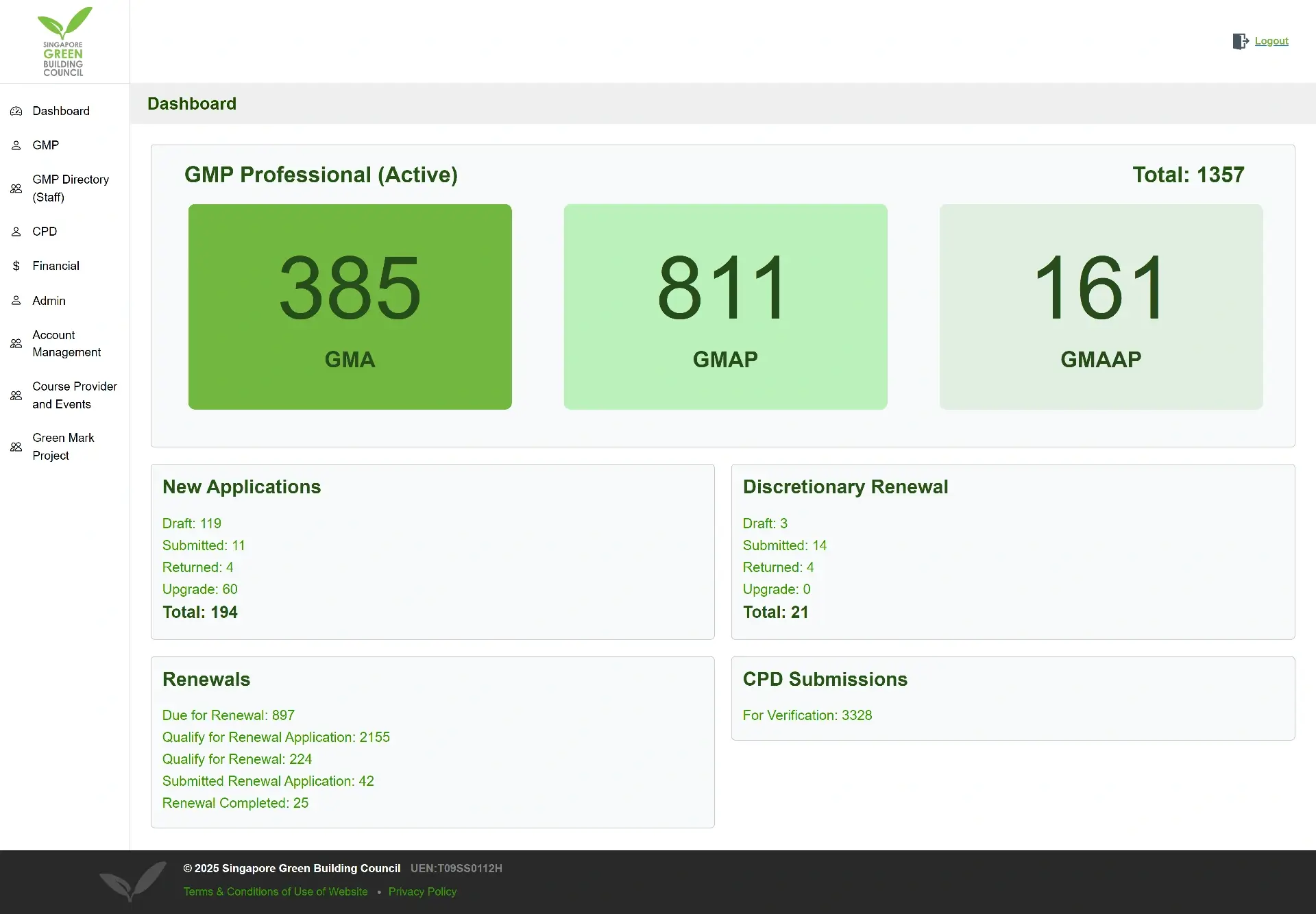 We delivered a powerful accreditation and course management system for the Singapore Green Building Council (SGBC), enabling professionals and administrators to manage the GMQP scheme, CPD tracking, and financial operations seamlessly.